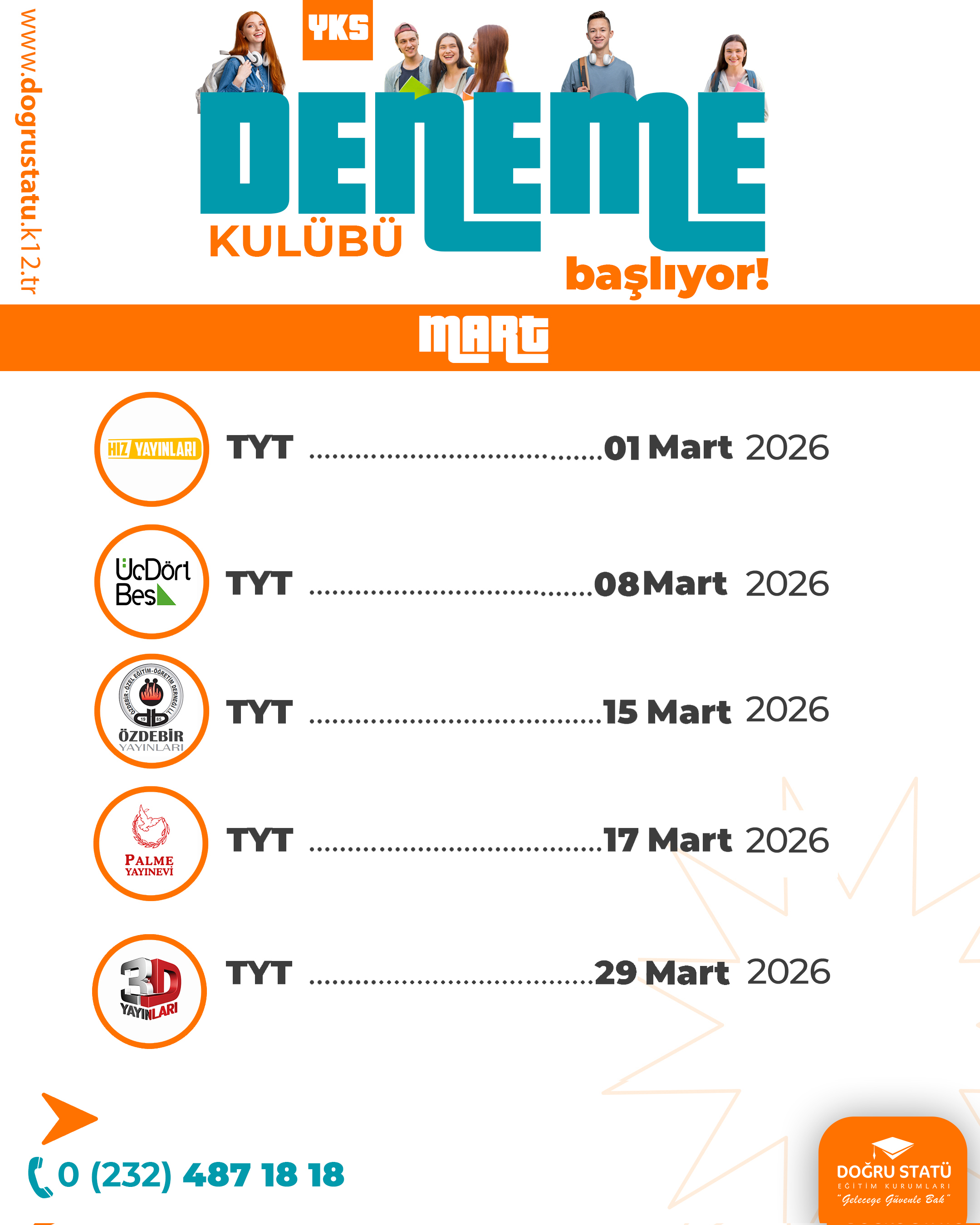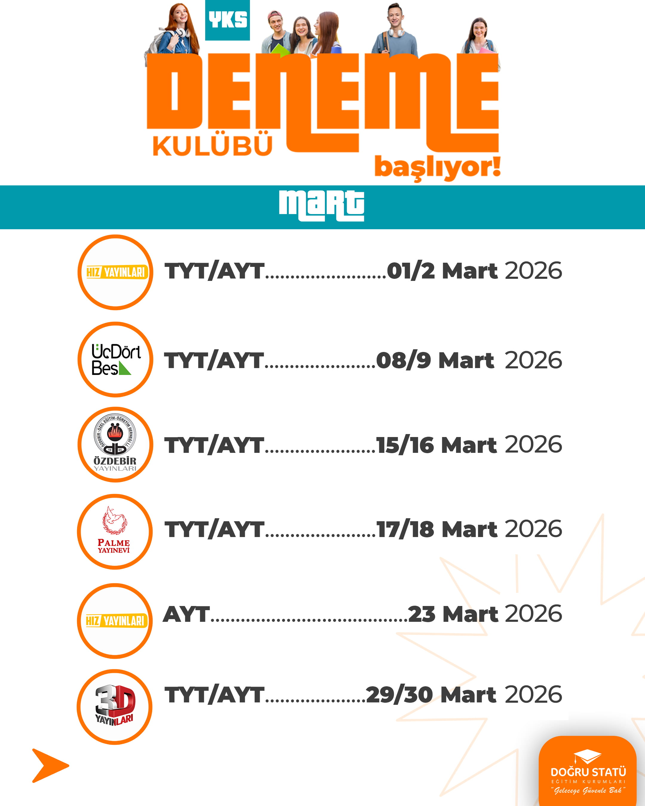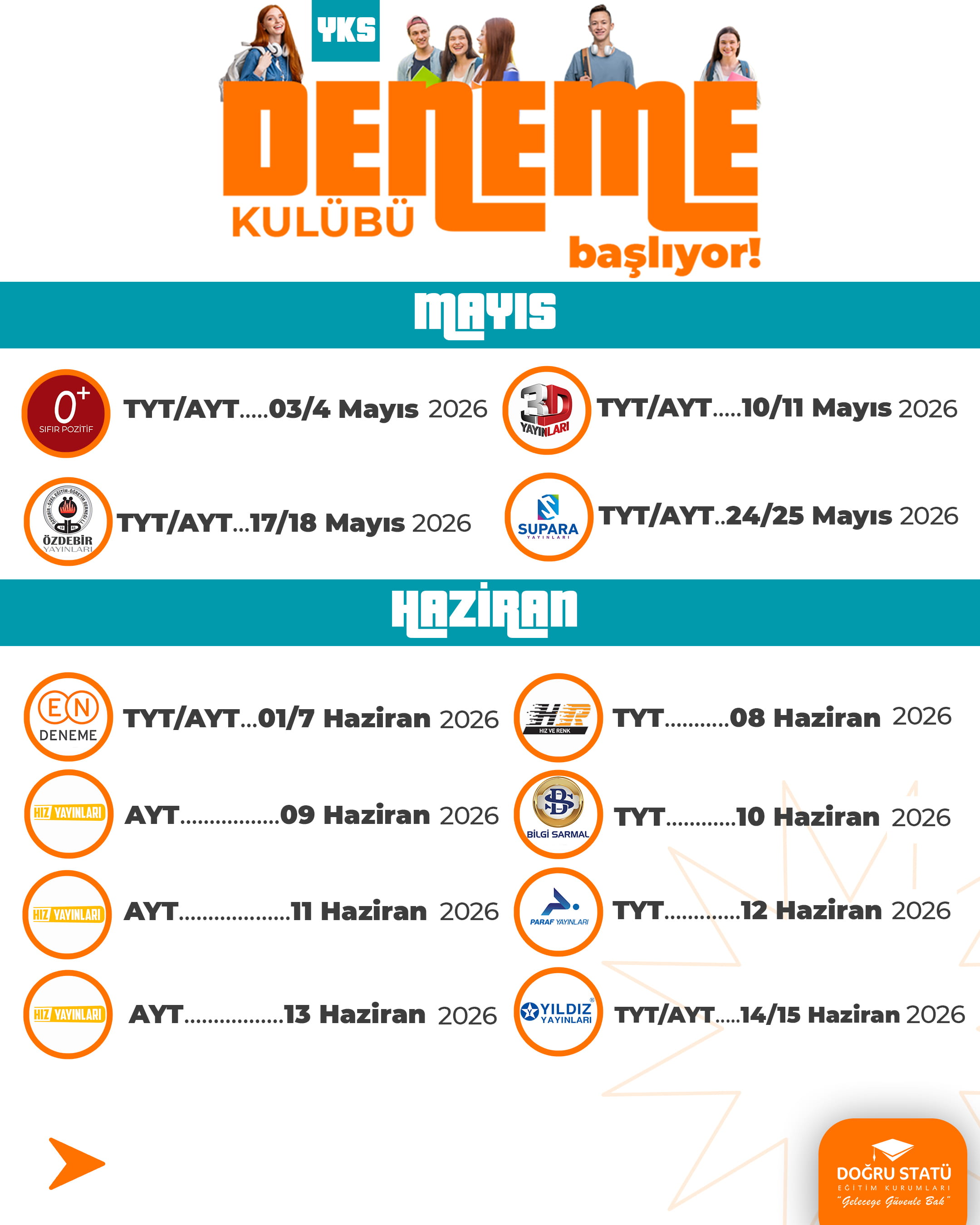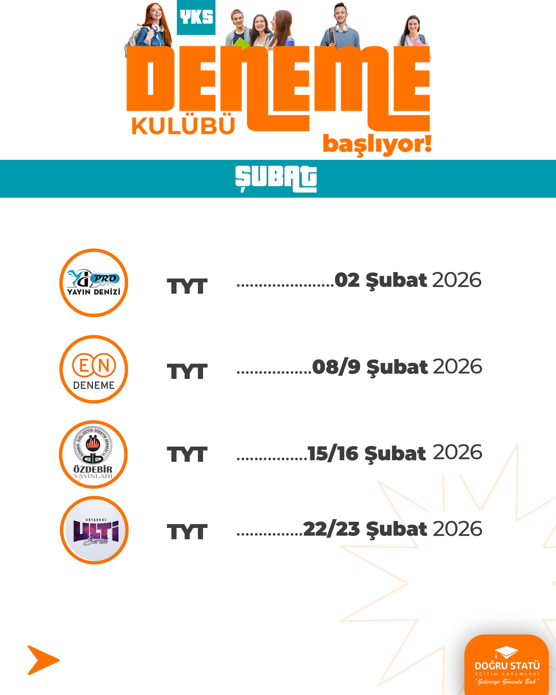 Doğru Statü Eğitim Kurumları olarak tüm merkezi sınavlara hazırlık sürecinde öğrencileri hedeflerine ulaştırmayı amaçlayan güçlü bir ölçme-değerlendirme altyapısı sunuyoruz. Alanında uzman ekipler tarafından hazırlanan nitelikli deneme sınavları, güncel müfredata uygun içerikler ve gerçek sınav formatına birebir uygulamalarla öğrencilerin seviyeleri doğru şekilde analiz ediyoruz. Her deneme, öğrencinin eksiklerini görmesini, gelişimini takip etmesini ve sınav stratejisini güçlendirmesini sağlar. Başarıya giden bu yolculukta, Doğru Statü ile süreci bilinçli ve güvenle yönetin.