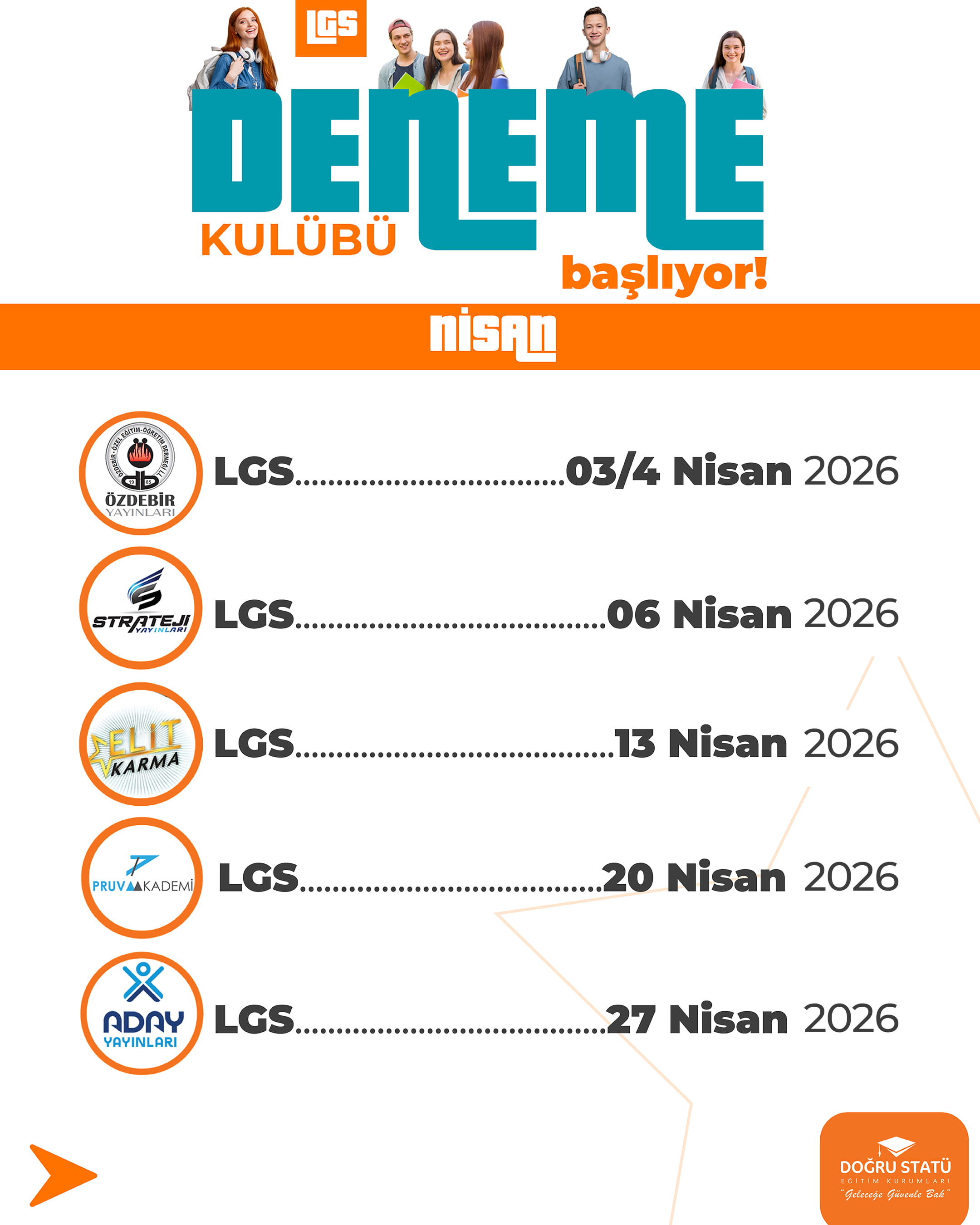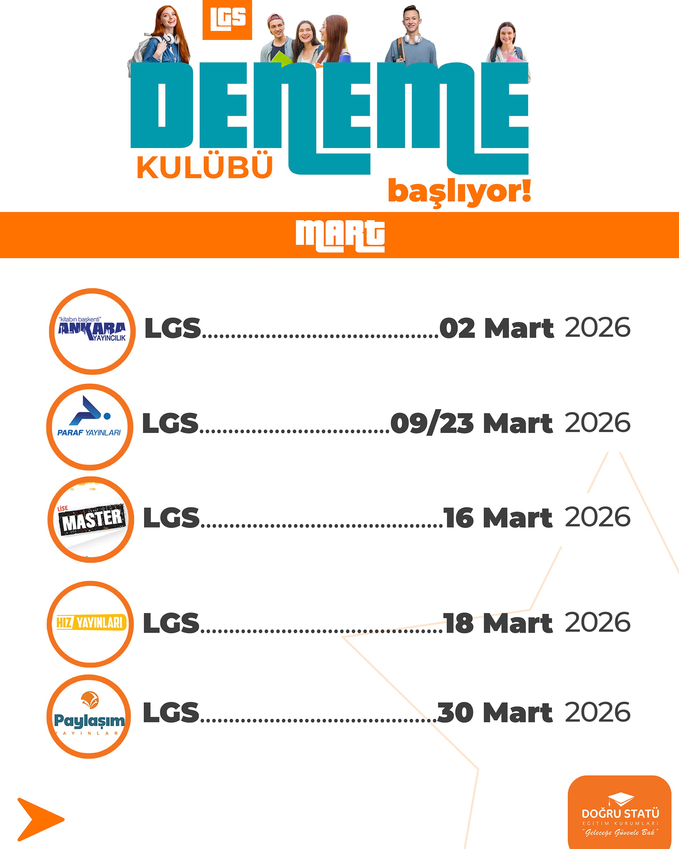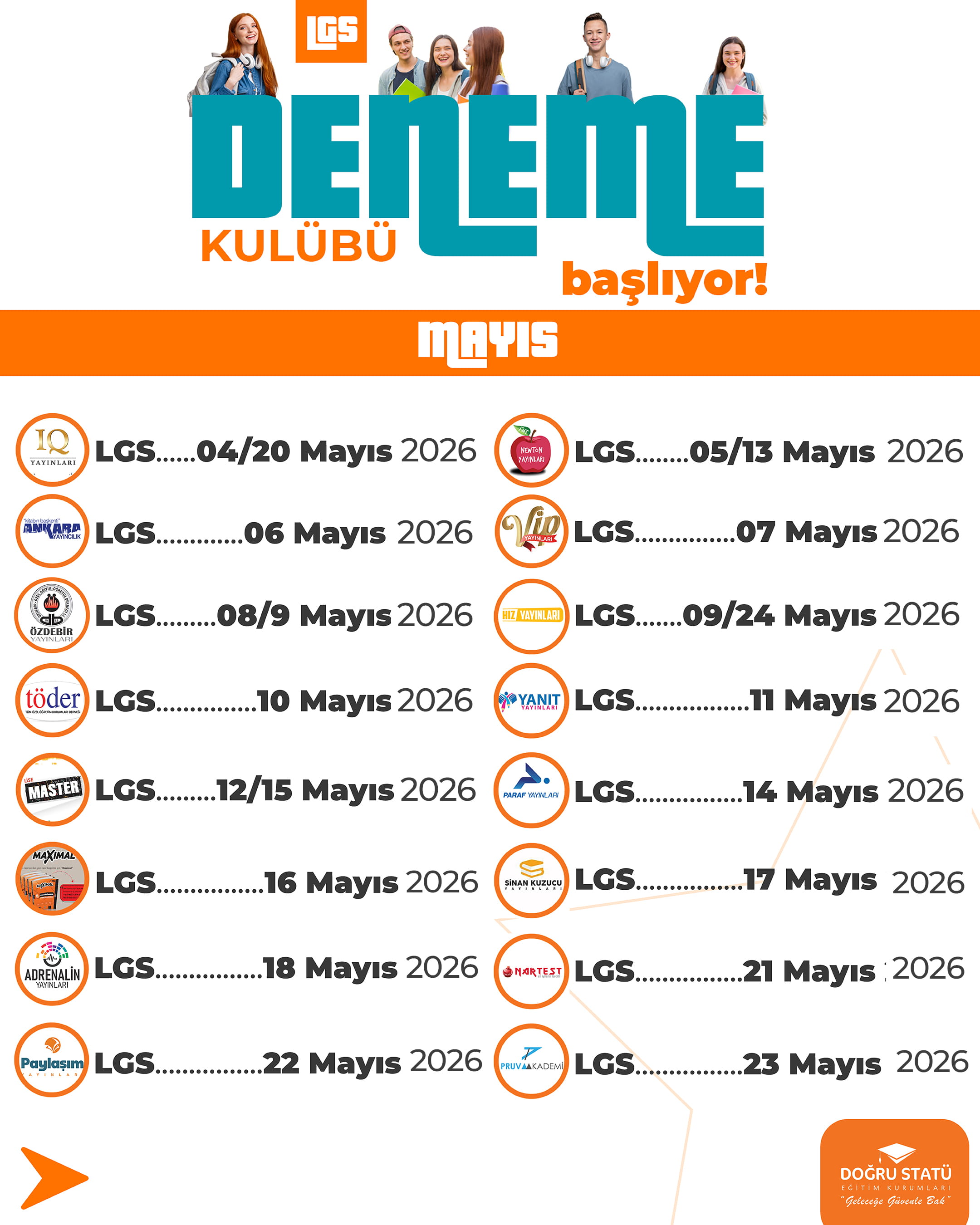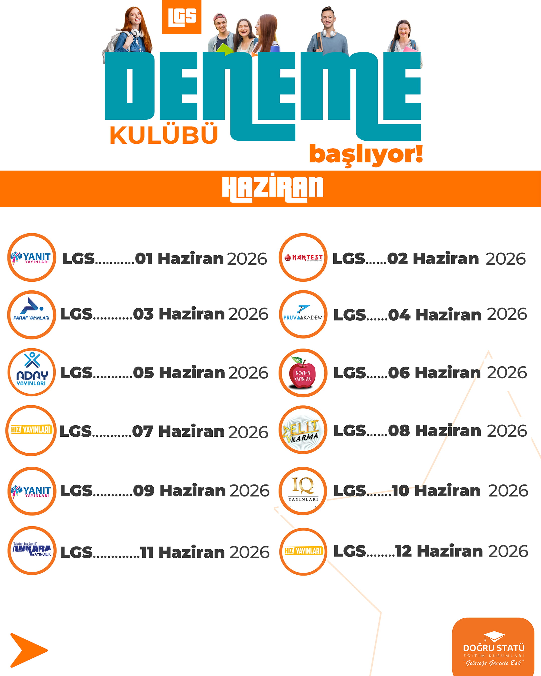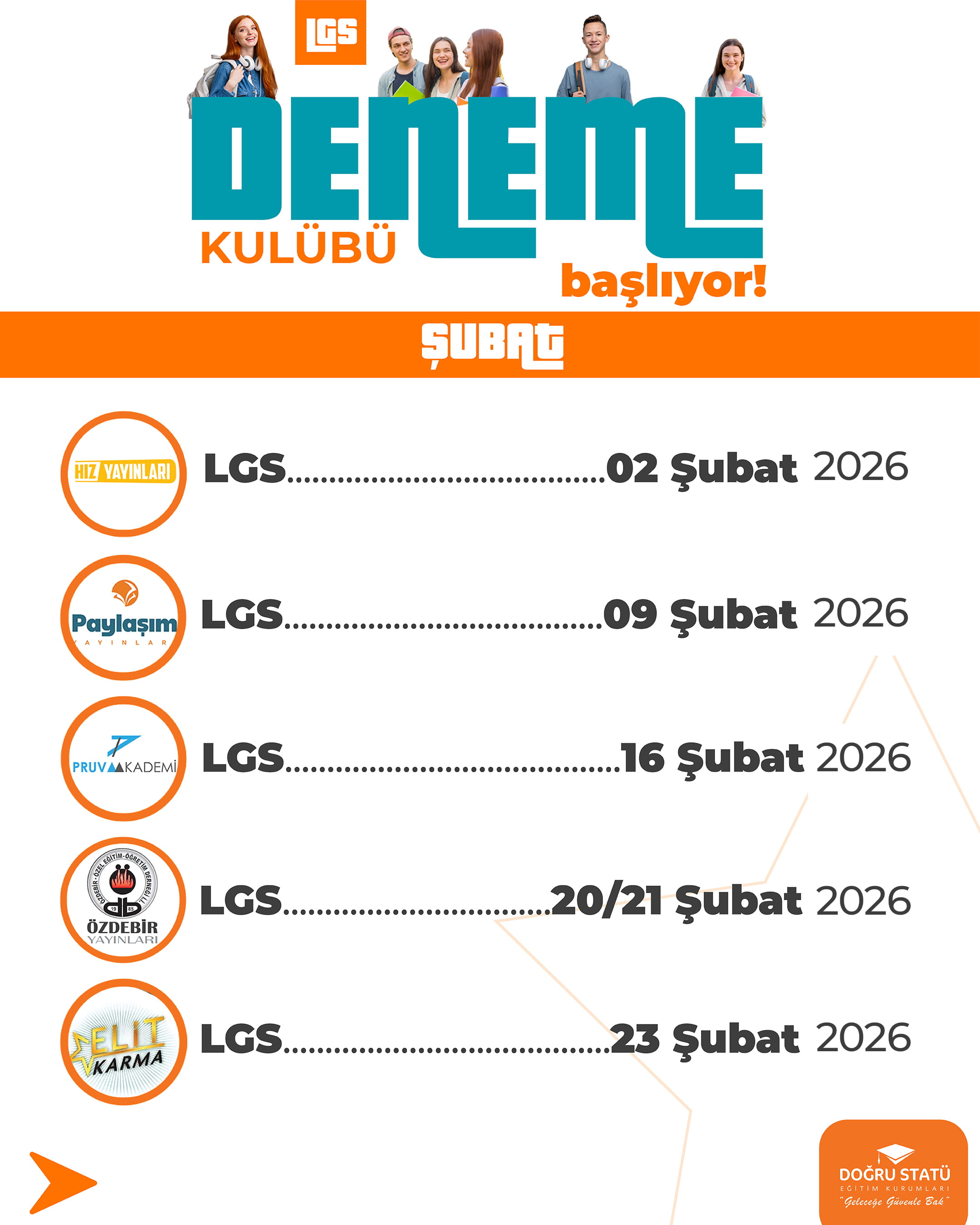 8. Sınıflar İçin Sistemli ve Gerçekçi Sınav Hazırlığı. LGS’ye hazırlık, rastgele çözülen denemelerle değil; doğru sırayla, doğru kaynaklarla ve düzenli analizle yapılır. Doğru Statü LGS Deneme Kulübü, 8. sınıf öğrencilerinin sınava Türkiye geneli standartlarda hazırlanması için özel olarak planlanmıştır.